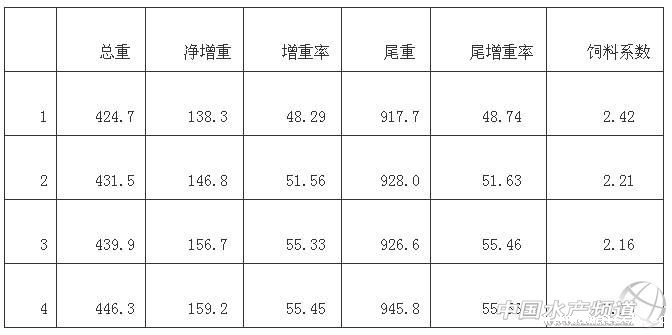 将试鱼随机投入4只网箱中,网箱在水中单行排列,水域条件一致,箱间距5米左右,以网箱为组,其中1组为对照组,2、3、4组试鱼总重和尾重分别为286.4kg、617g;284.7kg、612g;283.2kg、596g;287.1kg、608g,组间无显著性差异。
